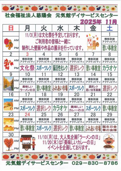 デイサービスでは11月に文化祭やラーメン・カレーなどの美味しい企画しています。